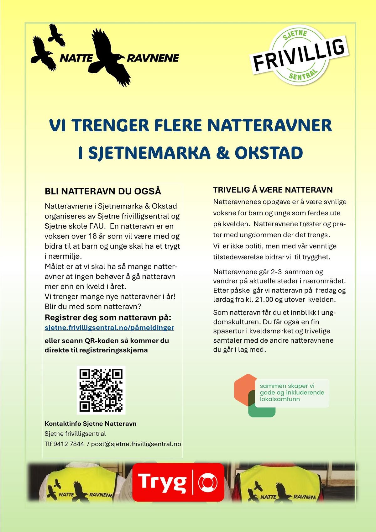 Klikk her for å registrere deg som natteravn i Sjetnemarka og Okstad, eller scann QR koden på plakaten og kom direkte til registreringsskjemaet. Når du har registrert deg tar vi kontakt og gir deg mer informasjon om det å være natteravn.