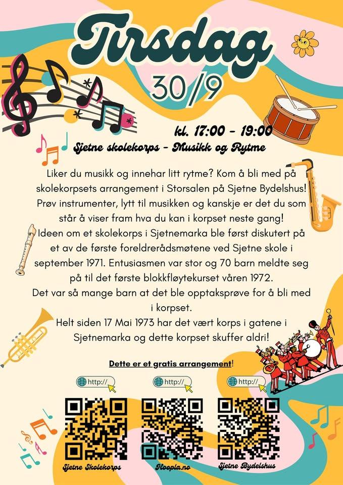 Sjetne Bydelshus er 40 år og vi feirer med Kulturuke i uke 40. Språkkafeen på tirsdag 30. september blir derfor litt uvanlig. Møt opp i 2. etg i Sjetne Bydelshus kl. 17.00. Der vil det bli mange artige aktiviteter med musikk, sang og rytme for både barn og voksne. Sjetne skolekorps og språkkafeen på Sjetne froivilligsentral samarbeider om arrangementet 30. september. Frivillige og deltakere på språkkafeen baker kake som deles ut gratis.Du vil bli kjent med skolekorpset, og vil få muligheten til å prøve deg på å dirigere et korps, lage din egen sang, prøve å spille på ulike instrumenter, bli med på rytme verksted og Kazooverksead