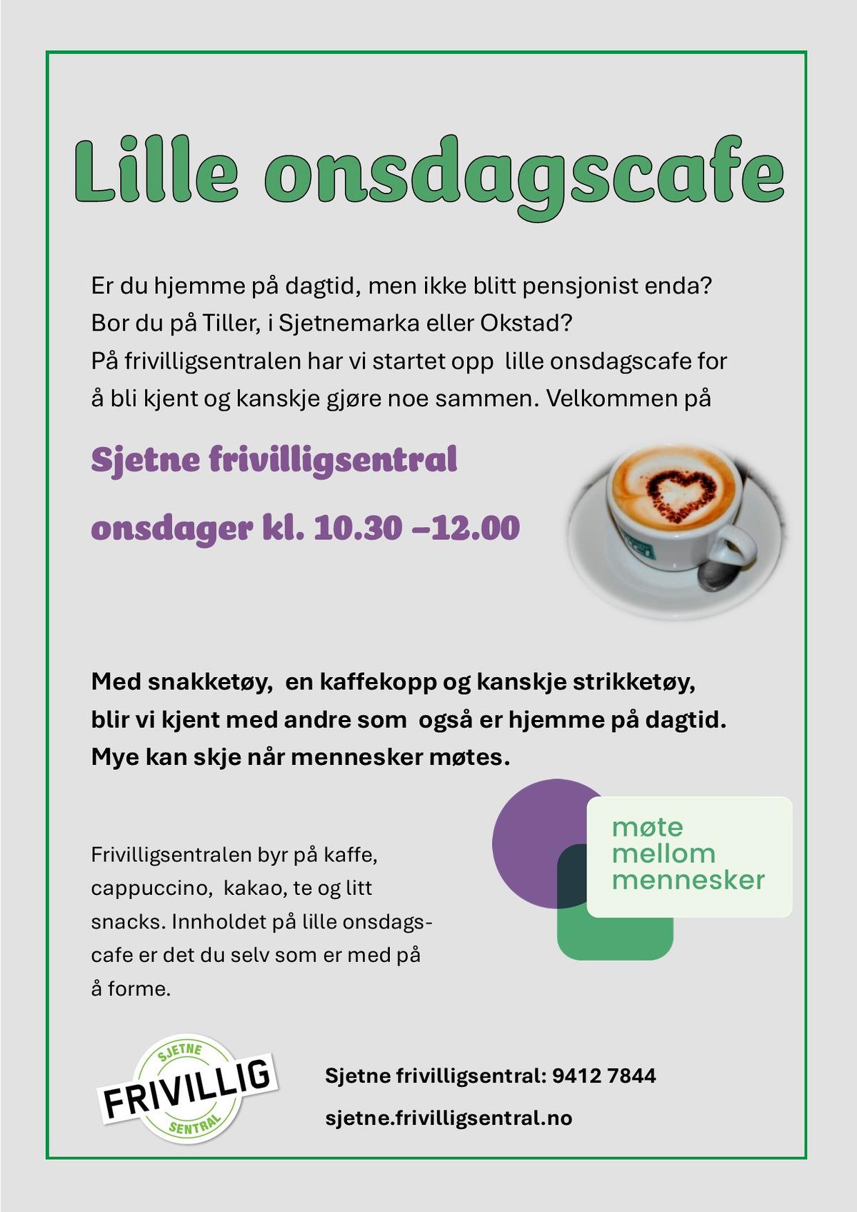 Er du hjemme på dagtid og kan tenke deg et felleskap med andre? Velkommen på lille onsdagscafe på frivilligsentralen!