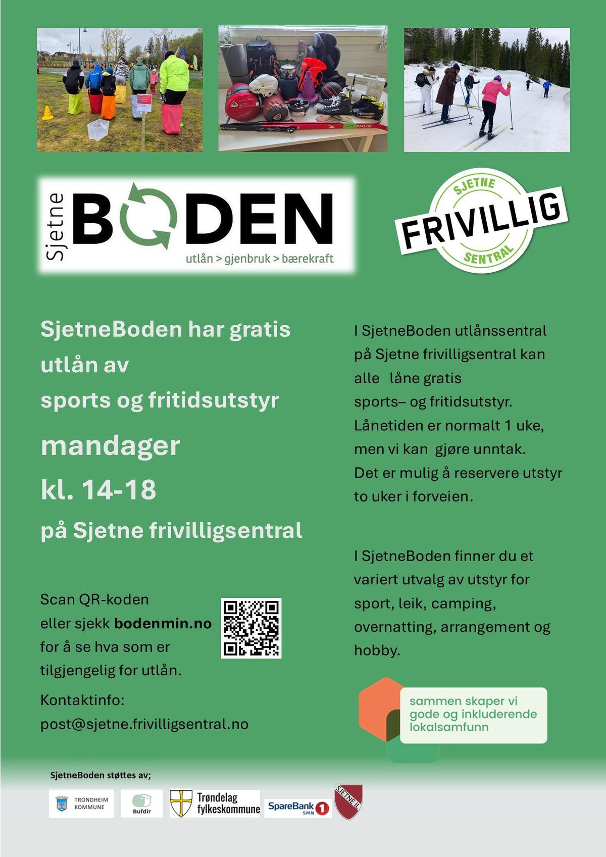 I SjetneBODEN på Sjetne frivilligsentral kan du gratis låne sports- og fritidsutstyr for fritid og leik. Åpningstid er mandager kl. 14.00-18.00.Alle kan låne sports og fritidsutstyr gratis i SjetneBODEN. Lånetiden er 1 uke, men vi kan gjøre unntak. Klikk her for å se hva som er tilgjengelig for utlån og registrere deg som låntaker. Om du ønsker å reservere utstyr, så send epost til post@sjetne.frivilligsentral.no og oppgi utstyr du ønsker å reservere. I åpningstiden kan du møte opp uten å ha reservert. Reservasjon kan ikke skje for mer enn 2 uker frem i tid.